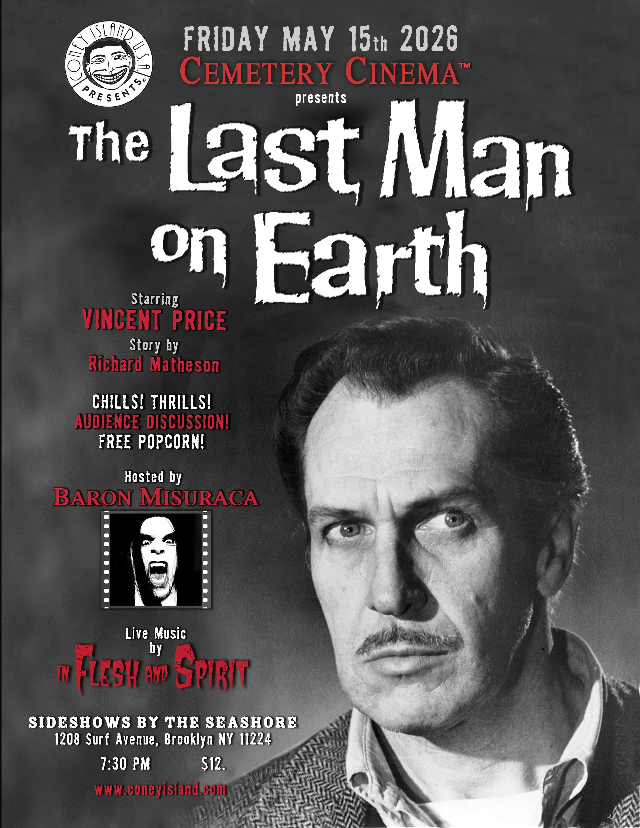 Hosted by Baron Misuraca, CEMETERY CINEMA returns to Coney Island on Friday, May 15th with the post apocalyptic horror thriller - THE LAST MAN ON EARTH! (Based on a novel by Twilight Zone writer Richard Matheson.)