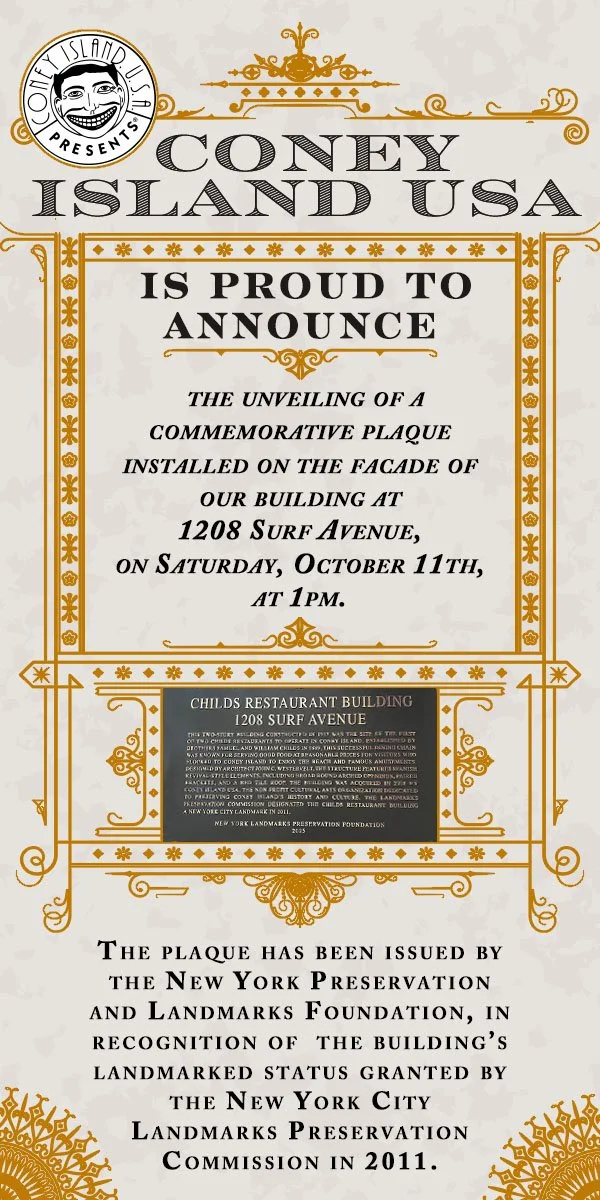 Back to All Events 1208 Surf Avenue Landmark Plaque Unveiling Saturday, October 11, 2025 1:00 PM 2:00 PM Coney Island USA 1208 Surf Avenue Brooklyn, NY, 11224 United States (map) Google Calendar ICS